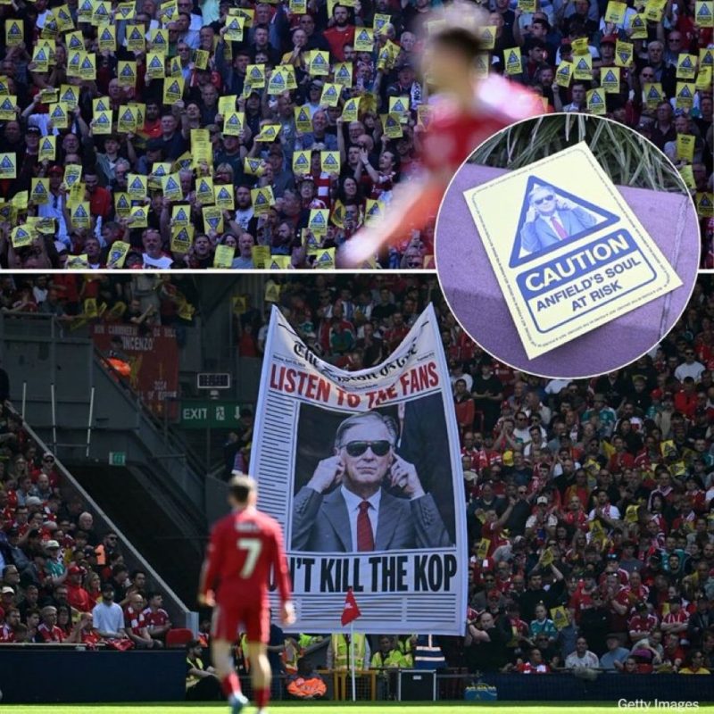 The cards themselves carried a striking design: a triangular warning sign featuring an image resembling FSG principal owner John W. Henry, with the message “CAUTION – ANFIELD’S SOUL AT RISK.” Large banners in the stands reinforced the message, showing Henry with hands over his ears alongside the plea “Don’t kill the Kop.”